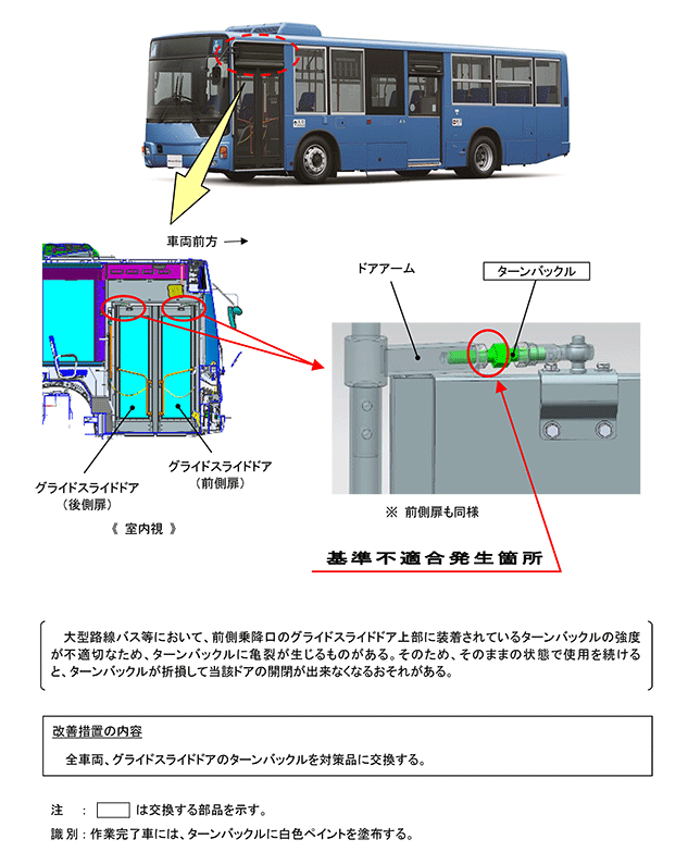 大型路線バス等において、前側乗降口のグライドスライドドア上部に装着されているターンバックルの強度が不適切なため、ターンバックルに亀裂が生じるものがある。そのため、そのままの状態で使用を続けると、ターンバックルが折損して当該ドアの開閉が出来なくなるおそれがある。 | ||