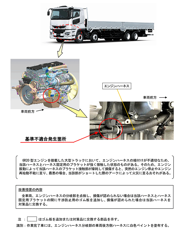 6R20型エンジンを搭載した大型トラックにおいて、エンジンハーネスの組付けが不適切なため、当該ハーネスとハーネス固定用のブラケットが強く接触した状態のものがある。そのため、エンジン振動によって当該ハーネスのブラケット接触部が摩耗して損傷すると、突然のエンジン停止やエンジン再始動不能に至り、最悪の場合、当該部がショートした際のアークによって火災に至るおそれがある。 | ||