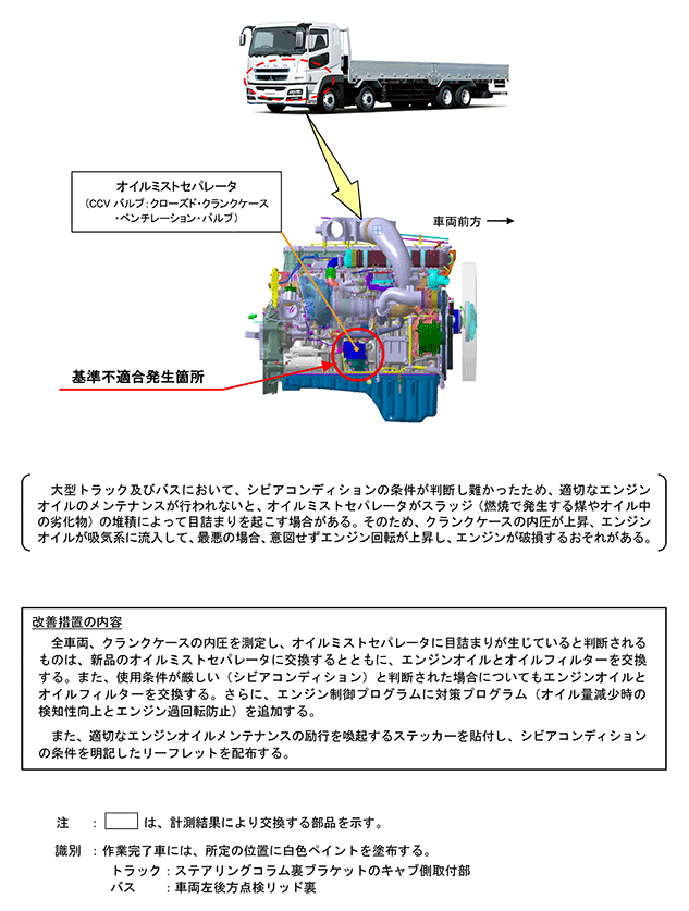 | 改善措置の内容 | 全車両、クランクケースの内圧を測定し、オイルミストセパレータに目詰まりが生じていると判断されるものは、新品のオイルミストセパレータに交換するとともに、エンジンオイルとオイルフィルターを交換する。また、使用条件が厳しい(シビアコンディション)と判断された場合についてもエンジンオイルとオイルフィルターを交換する。さらに、エンジン制御プログラムに対策プログラム(オイル量減少時の検知性向上とエンジン過回転防止)を追加する。 また、適切なエンジンオイルメンテナンスの励行を喚起するステッカーを貼付し、シビアコンディションの条件を明記したリーフレットを配布する。 |