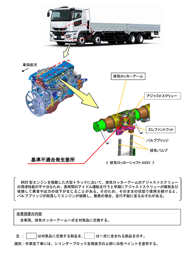 6R20型エンジンを搭載した大型トラックにおいて、排気ロッカーアームのアジャストスクリューの潤滑性能が不十分なため、長時間のアイドル運転を行うと早期にアジャストスクリューが摩耗及び破損して異音や出力の低下が生じることがある。そのため、そのままの状態で使用を続けると、バルブブリッジが脱落してエンジンが破損し、最悪の場合、走行不能に至るおそれがある。 | ||