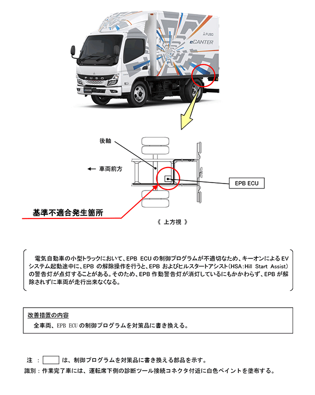ふそうeCANTERの制動装置(電動式パーキングブレーキ)のリコールについて、令和6年 3月26日に下記のリコールを国土交通省に届け出ました。ご愛用車の措置について、販売会社から早急にご連絡・ご相談をさせていただきますので、よろしくお願い申し上げます。