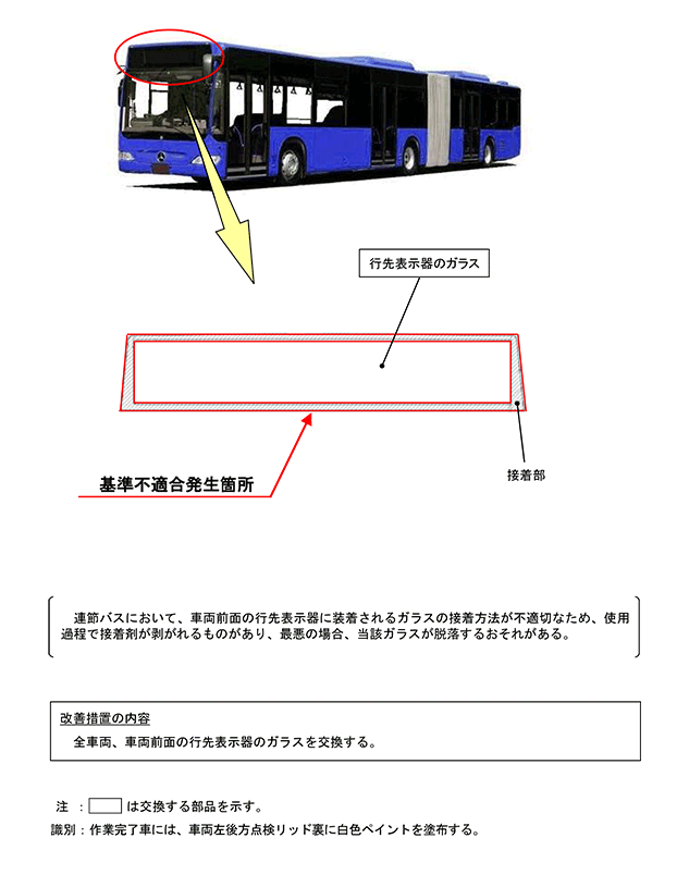 連節バスにおいて、車両前面の行先表示器に装着されるガラスの接着方法が不適切なため、使用過程で接着剤が剥がれるものがあり、最悪の場合、当該ガラスが脱落するおそれがある。