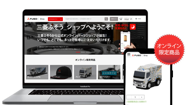 「三菱ふそう_ショップ」なら、時間や曜日を選ばずに*²、 PC やスマホからすぐにオーダー可能。