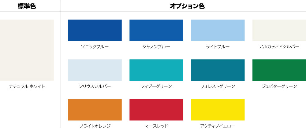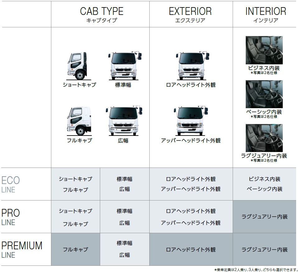 *このほかに、365色対応ふそう純正カラーペイントでお好みのキャブ色(有料)が選べます。高機能パッケージ・機能アップパッケージも選択可能(除くプレミアム・ライン)です。