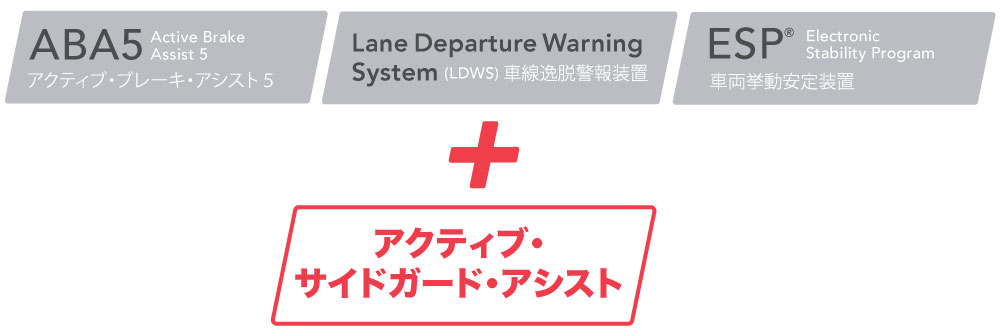 アクティブ・サイドガード・アシストは、ドライバーの誤認防止を補助するもので、居眠り 運 転やわき見 運 転を可 能にするものでは ありません。認識性能には限界があります。システムを過信せず、走行する時は必ず周囲の安全を確認し、安全運転を心掛けてください。詳しくは取扱説明書をご覧ください。