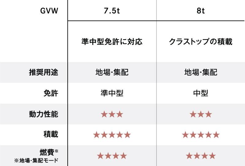 軽量・小排気量の4V20エンジン搭載車は、キャブ付シャシ重量を大幅に低減。GVW8tクラスでトップレベルの高積載を実現しています。
