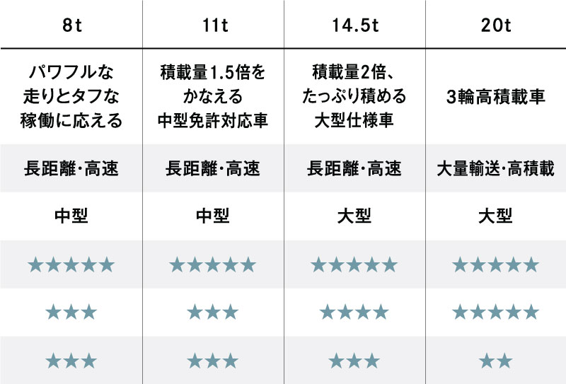 さらに、人を基本とした快適な走りと新次元の効率性・経済性を追求。そして、4気筒車と6気筒車から選べる充実した車種ラインアップ。あらゆる稼働シーンで、プロドライバー達の熱い要求に応えます。