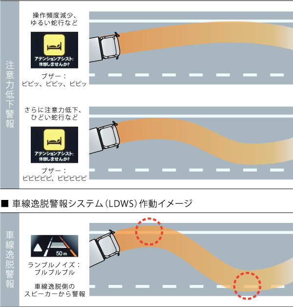 ※1 黄線も認識します。 ※2 LDWS:Lane Departure Warning System *アテンション・アシストは車速60km/h以上で作動します。車線逸脱警報システム(LDWS)は、アテンション・アシストの機能に含まれます。また、LDWSの装着法規要件に適合しています。