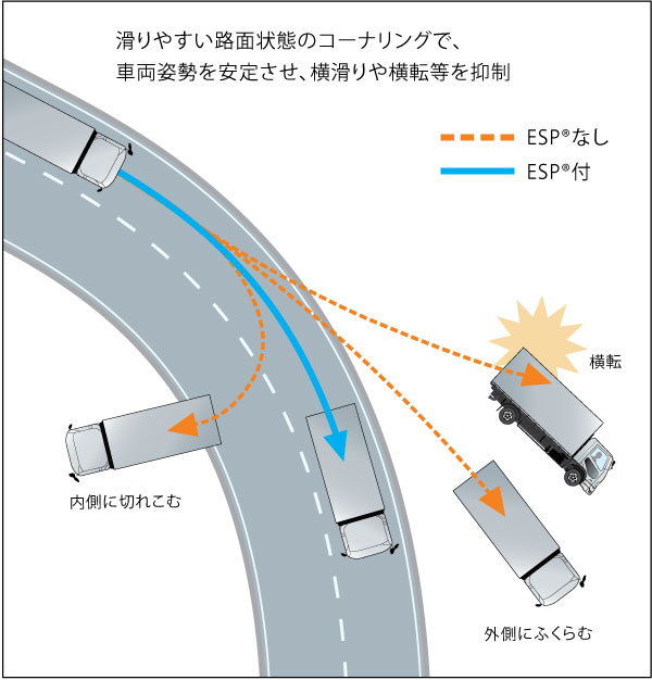 車両を安定させ、横滑りや横転事故を抑制します。走行する車両の姿勢を常にセンサーで検知。カーブや車線変更時に、ステアリング操作と車両挙動の変化により、車両姿勢が不安定になった場合に警告を行います。