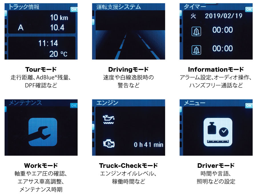 ●マルチファンクションモニター(メニュー選択)●ラジオ(音量調整)●エアサス車高調整(車高調整・車高メモリー)●エンジン回転数調整(暖機アイドル回転数調整、PTO作業時のエンジン回転数調整)
