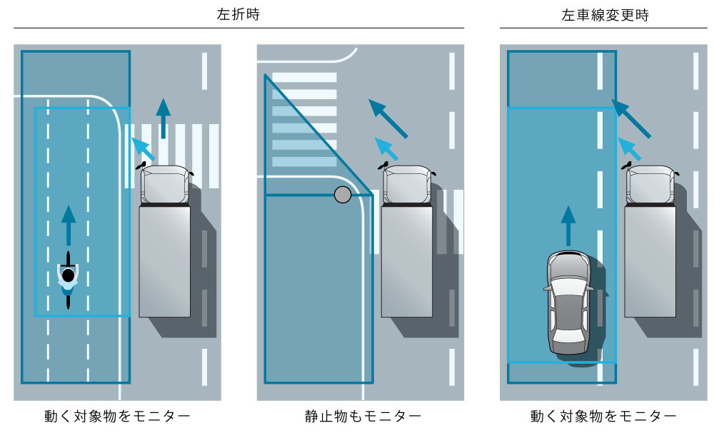 左折巻き込み事故のリスクを低減させます。左折時や左車線への車線変更時に、車両の通過する範囲を予測し、範囲内にあるものを検出。危険を感知すると助手席ドアピラー部にある警報ランプが黄色に点灯し、ドライバーに注意を促します。