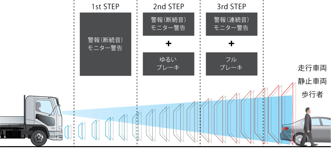 走行車両、静止車両、歩行者などに対して、衝突の危険性があるときに、対象との距離や走行状況に応じて警報ブザーとメーター内のモニター表示で警報し、ドライバーの衝突回避操作を促します。さらに、必要に応じてブレーキを作動させ、衝突回避または被害の軽減を支援します。
