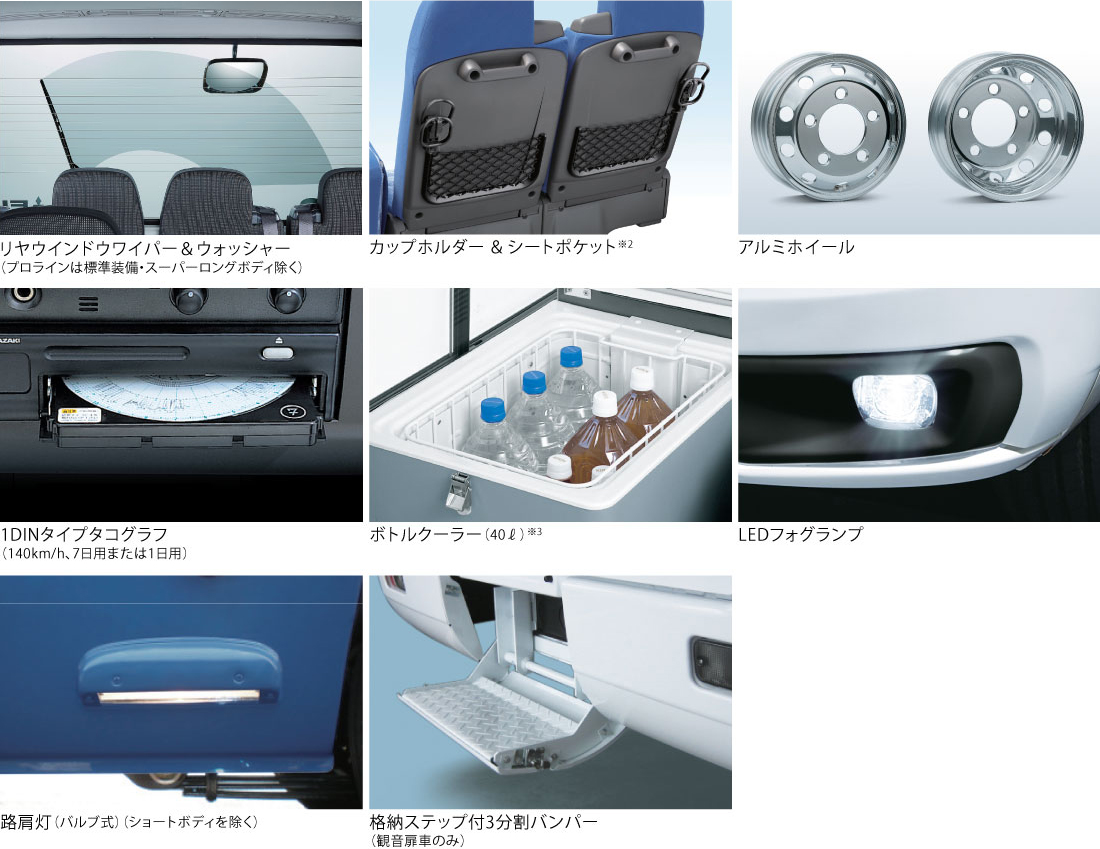 ●LSD(リミテッド・スリップ・デフ) ●ヒーター付燃料フィルター※4 ●−35℃対応不凍液 ●プレヒーター(5kWまたは10kW)※4 ●エンブレム&ステッカー車載(スリーダイヤエンブレム/FUSO・DUONIC®ステッカー/スペアタイヤキャリア・燃費基準達成車・ポスト新長期適合車ラベルの車載納品)●カーテン ●乗降口両側手すり ●オーバーヘッドトレイ(両側)(運転席は全車標準装備)